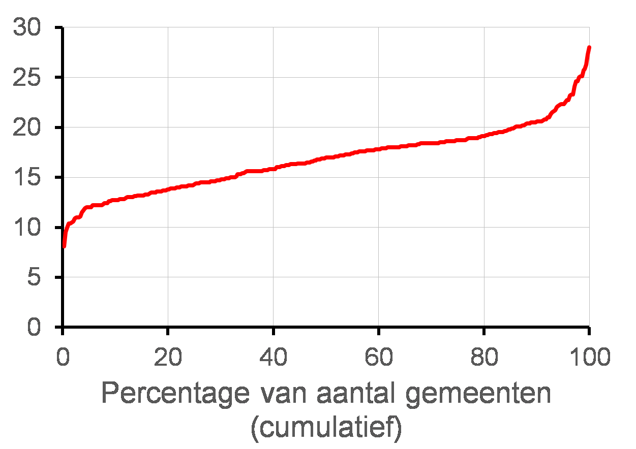 Onder de kaart en de tekst vindt u bij veel kaarten nog een figuur met een rode lijn. In deze figuur zijn alle gemeenten gerangschikt van laagste naar hoogste waarde.