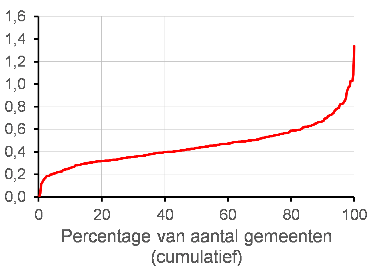 Onder de kaart en de tekst vindt u bij veel kaarten nog een figuur met een rode lijn. In deze figuur zijn alle gemeenten gerangschikt van laagste naar hoogste waarde.