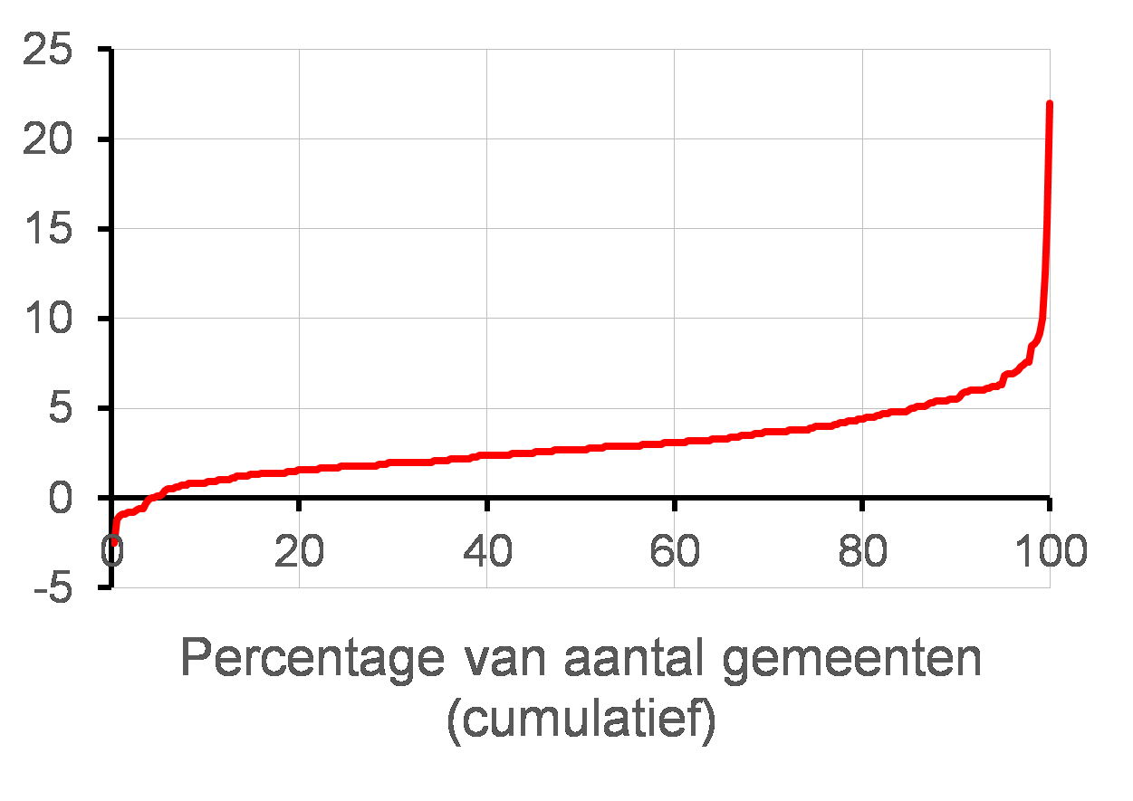Onder de kaart en de tekst vindt u bij veel kaarten nog een figuur met een rode lijn. In deze figuur zijn alle gemeenten gerangschikt van laagste naar hoogste waarde.