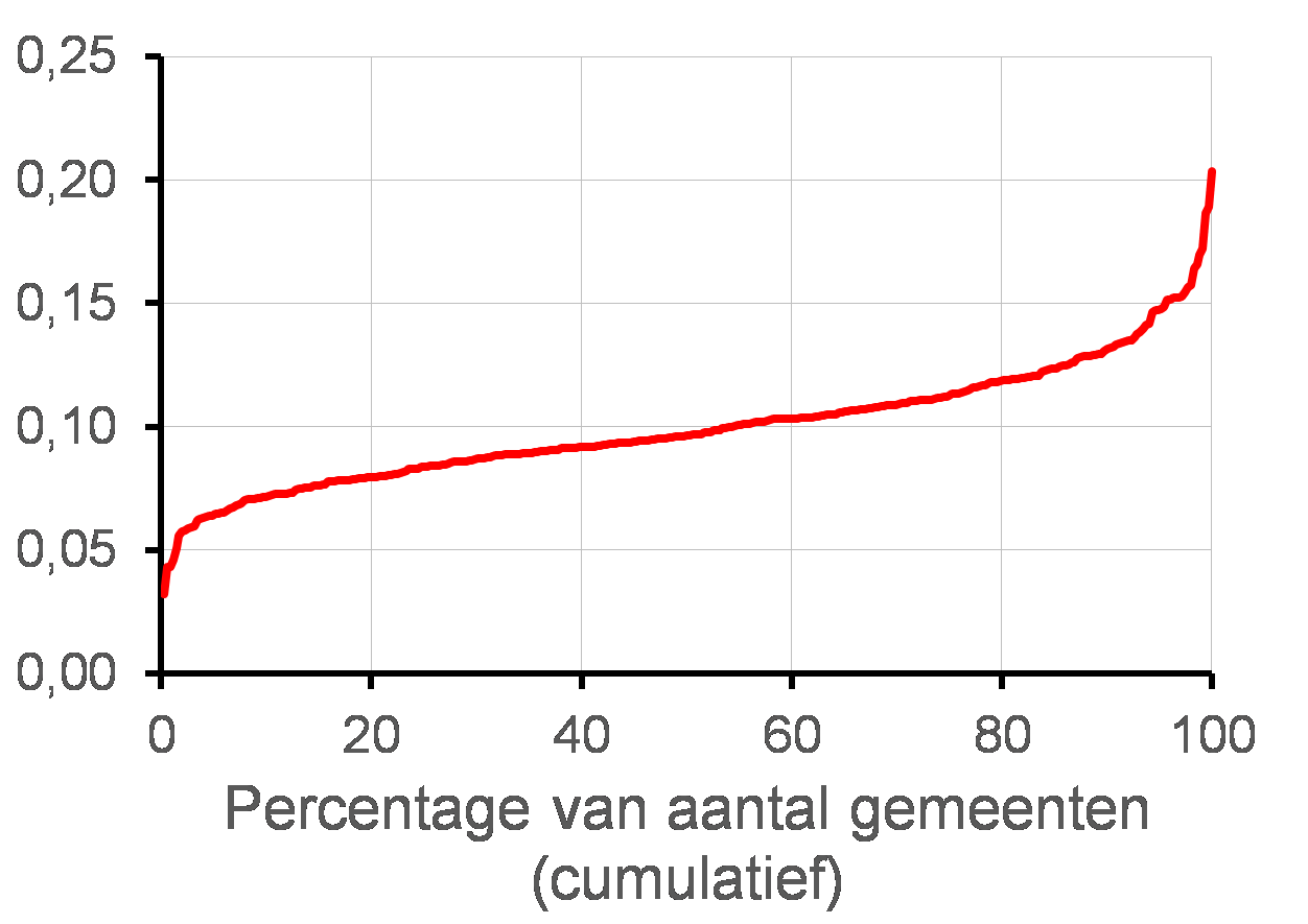 Onder de kaart en de tekst vindt u bij veel kaarten nog een figuur met een rode lijn. In deze figuur zijn alle gemeenten gerangschikt van laagste naar hoogste waarde.