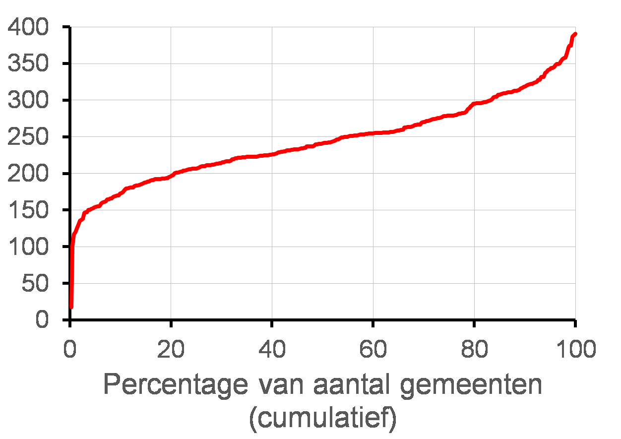 Onder de kaart en de tekst vindt u bij veel kaarten nog een figuur met een rode lijn. In deze figuur zijn alle gemeenten gerangschikt van laagste naar hoogste waarde.