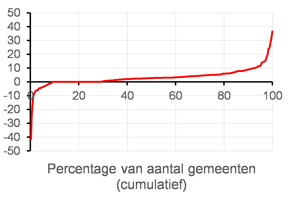 Onder de kaart en de tekst vindt u bij veel kaarten nog een figuur met een rode lijn. In deze figuur zijn alle gemeenten gerangschikt van laagste naar hoogste waarde.