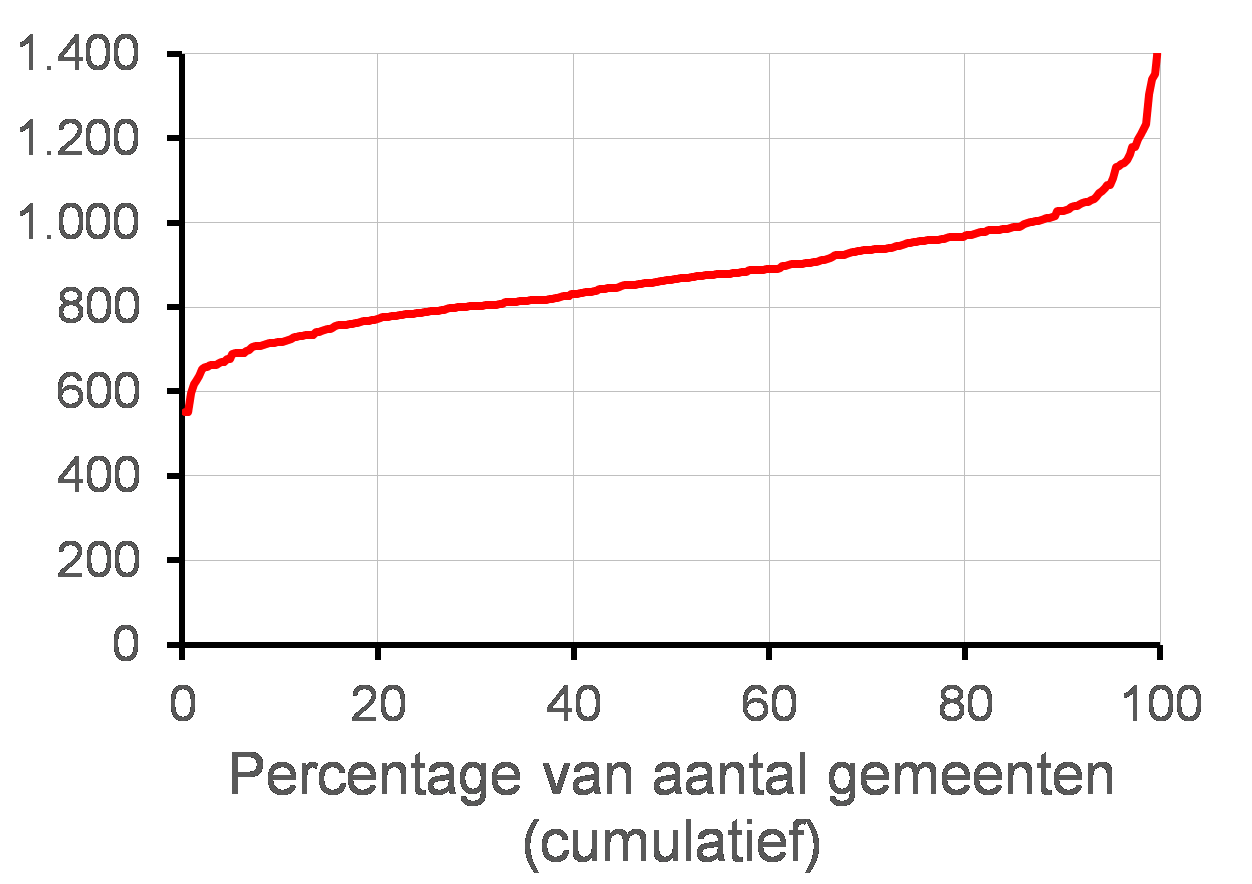 Onder de kaart en de tekst vindt u bij veel kaarten nog een figuur met een rode lijn. In deze figuur zijn alle gemeenten gerangschikt van laagste naar hoogste waarde.