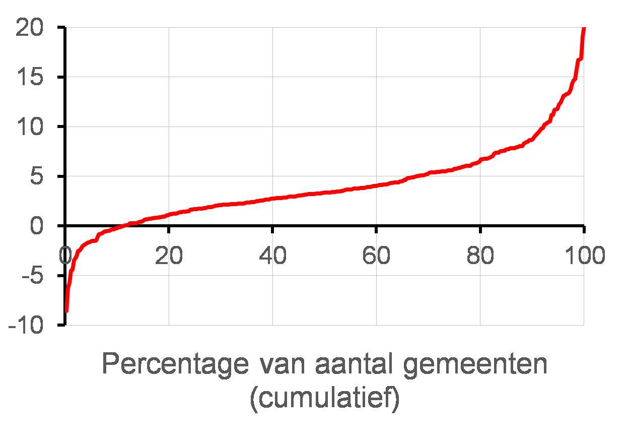 Onder de kaart en de tekst vindt u bij veel kaarten nog een figuur met een rode lijn. In deze figuur zijn alle gemeenten gerangschikt van laagste naar hoogste waarde.