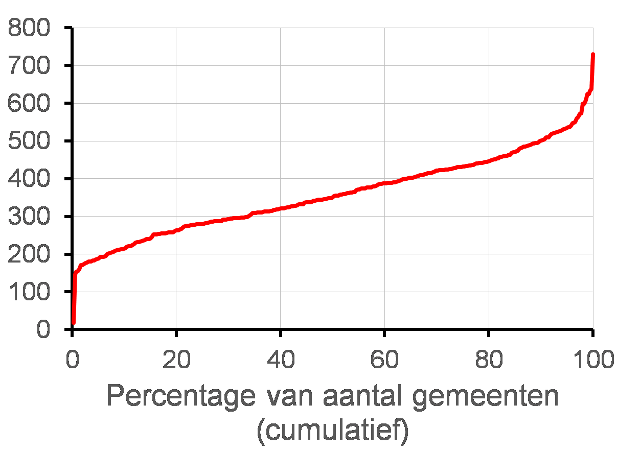 Onder de kaart en de tekst vindt u bij veel kaarten nog een figuur met een rode lijn. In deze figuur zijn alle gemeenten gerangschikt van laagste naar hoogste waarde.