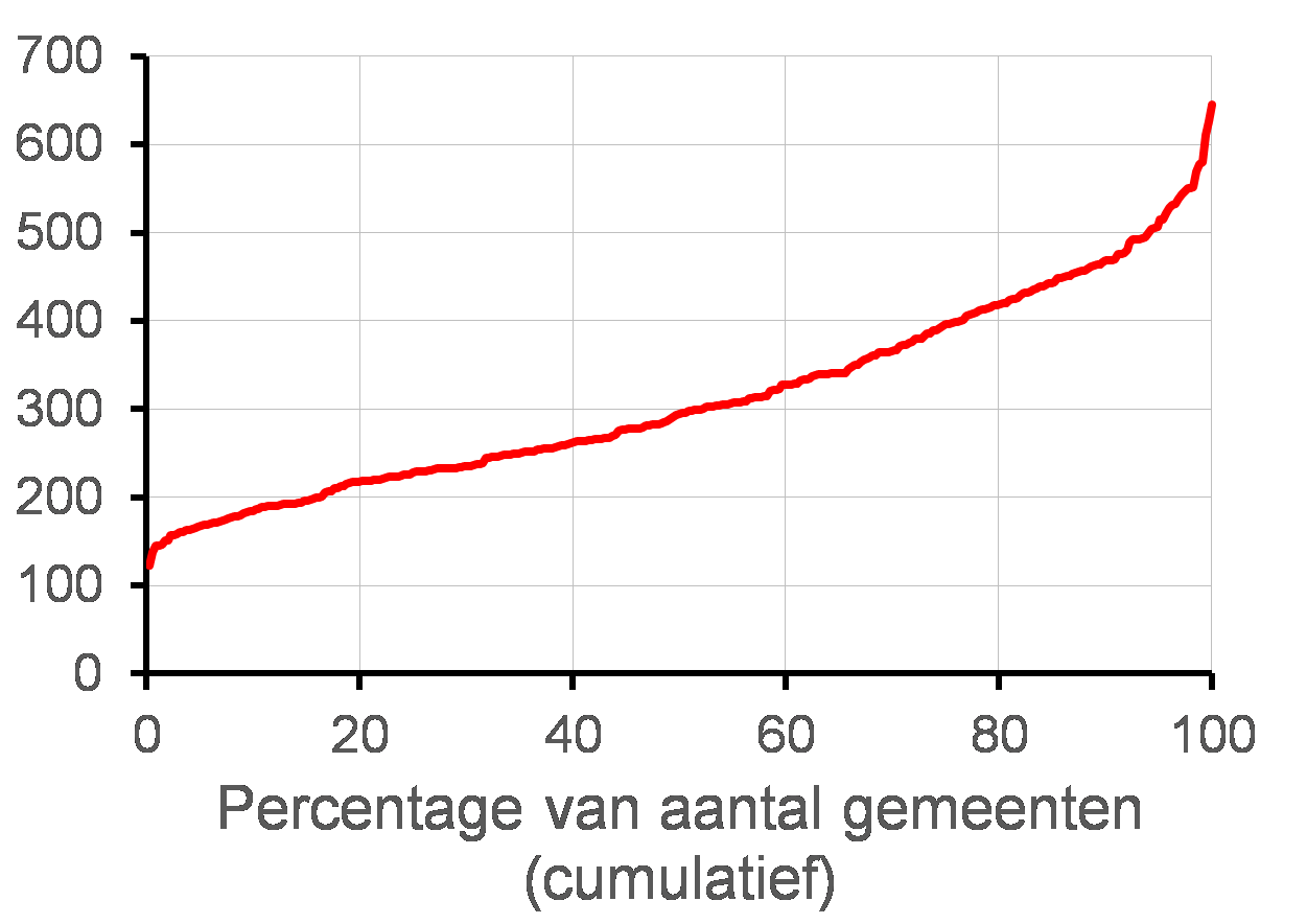 Onder de kaart en de tekst vindt u bij veel kaarten nog een figuur met een rode lijn. In deze figuur zijn alle gemeenten gerangschikt van laagste naar hoogste waarde.