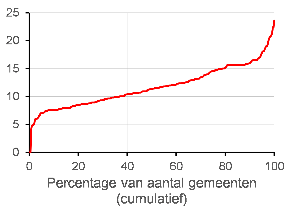 Onder de kaart en de tekst vindt u bij veel kaarten nog een figuur met een rode lijn. In deze figuur zijn alle gemeenten gerangschikt van laagste naar hoogste waarde.