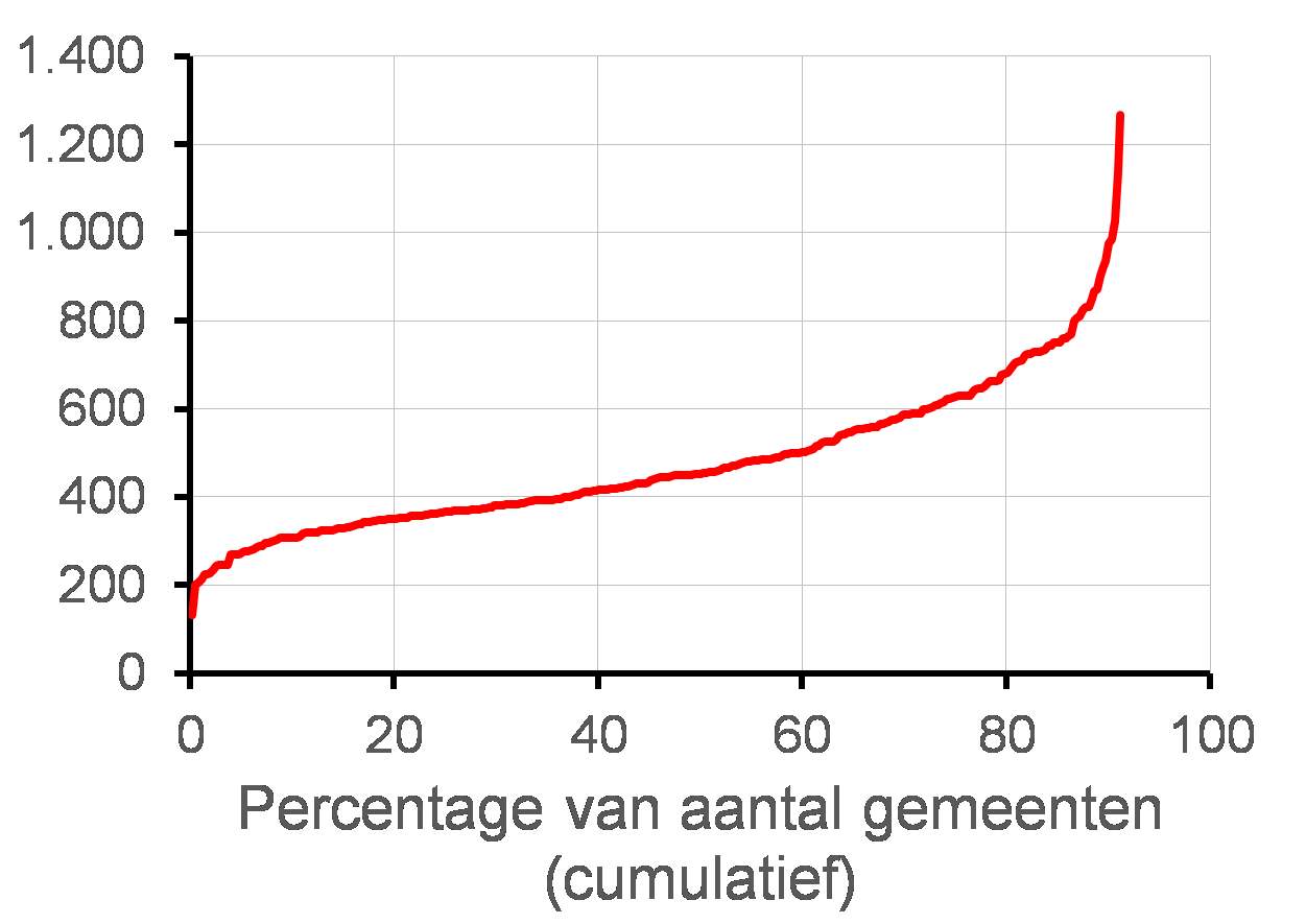 Onder de kaart en de tekst vindt u bij veel kaarten nog een figuur met een rode lijn. In deze figuur zijn alle gemeenten gerangschikt van laagste naar hoogste waarde.