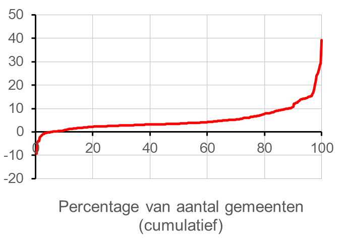 Onder de kaart en de tekst vindt u bij veel kaarten nog een figuur met een rode lijn. In deze figuur zijn alle gemeenten gerangschikt van laagste naar hoogste waarde.