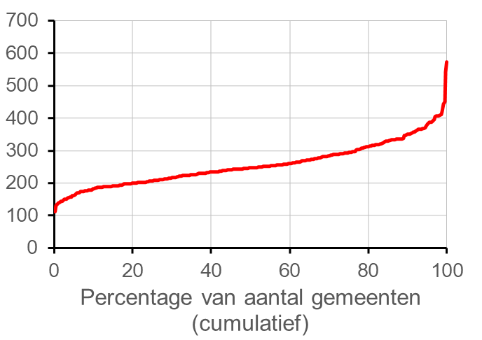 Onder de kaart en de tekst vindt u bij veel kaarten nog een figuur met een rode lijn. In deze figuur zijn alle gemeenten gerangschikt van laagste naar hoogste waarde.