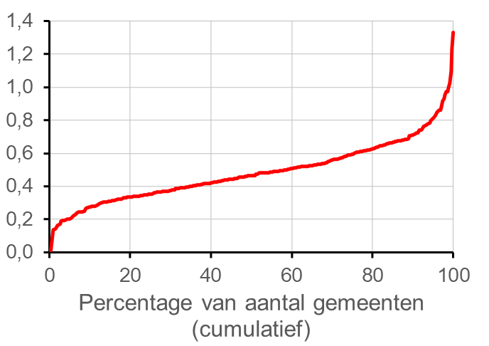 Onder de kaart en de tekst vindt u bij veel kaarten nog een figuur met een rode lijn. In deze figuur zijn alle gemeenten gerangschikt van laagste naar hoogste waarde.