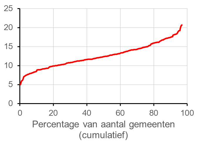 Onder de kaart en de tekst vindt u bij veel kaarten nog een figuur met een rode lijn. In deze figuur zijn alle gemeenten gerangschikt van laagste naar hoogste waarde.