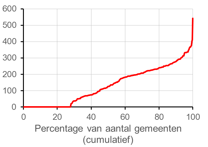 Onder de kaart en de tekst vindt u bij veel kaarten nog een figuur met een rode lijn. In deze figuur zijn alle gemeenten gerangschikt van laagste naar hoogste waarde.