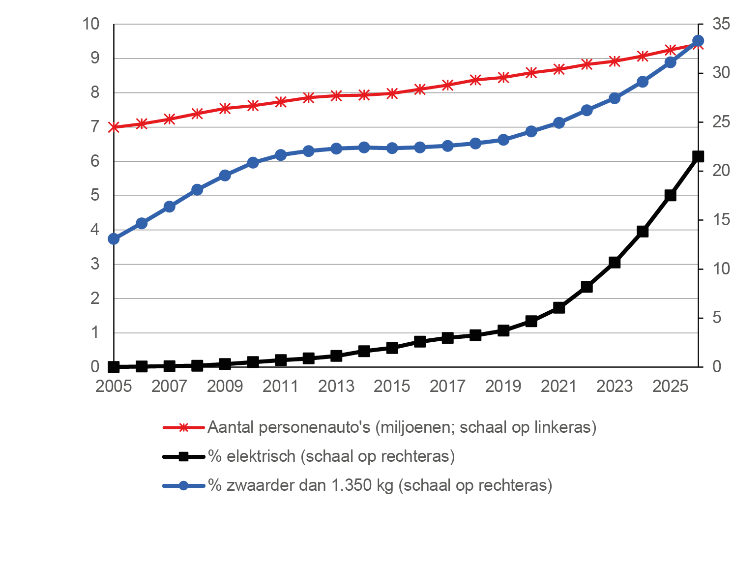 Bron: CBS. Het percentage personenauto’s dat zwaarder is dan 1.350 kilo is inclusief elektrische auto’s.