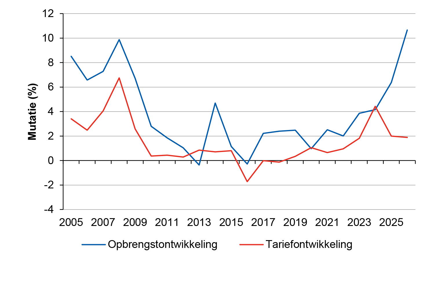 Deze vrijstelling heeft wel gevolgen gehad voor de opbrengsten uit de opcenten op de motorrijtuigenbelasting. In figuur 15 is te zien dat deze opbrengst meestal sterker stijgt dan het gemiddelde tarief. De jaren waarin een vrijstelling voor elektrische voertuigen werd ingevoerd (2013 en 2020) zijn de enige jaren waarin de opbrengst minder sterk stijgt dan het tarief. In 2026 is de stijging van de opbrengst met 10,7 procent aanzienlijk hoger dan de stijging van het tarief (1,9 procent).