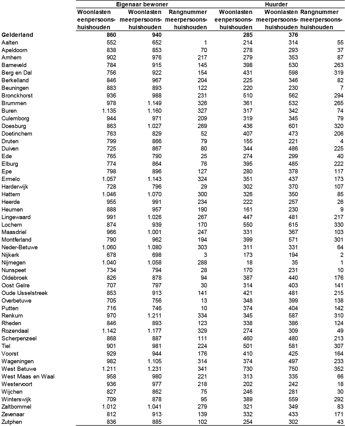 Hier vindt u een overzicht van de woonlasten per gemeente voor eigenaar-bewoners en huurders in de provincie Gelderland.