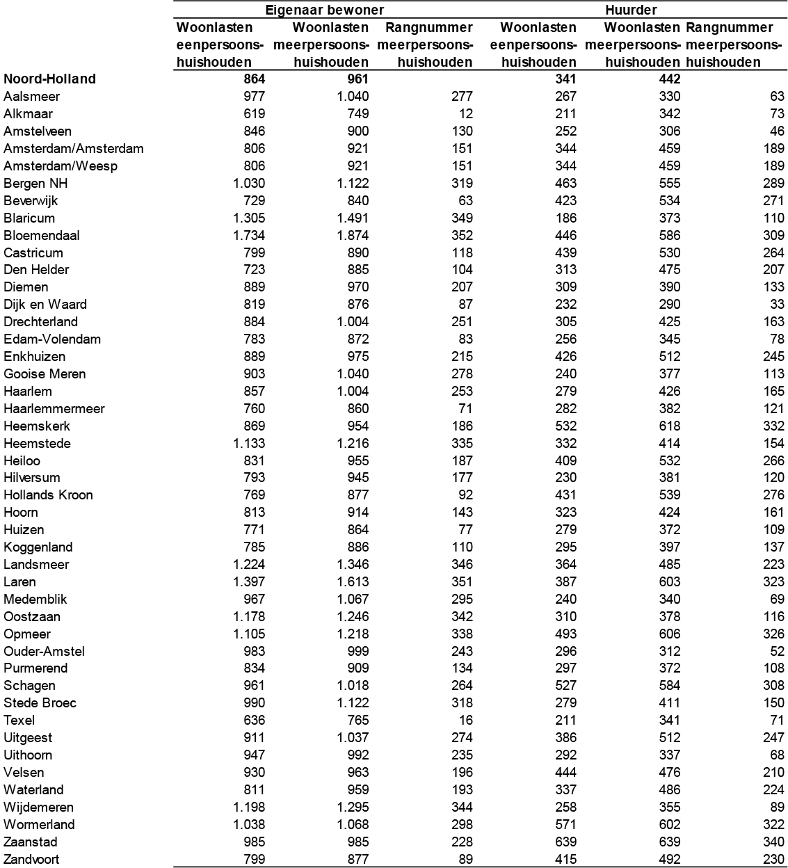 Hier vindt u een overzicht van de woonlasten per gemeente voor eigenaar-bewoners en huurders in de provincie Noord-Holland.