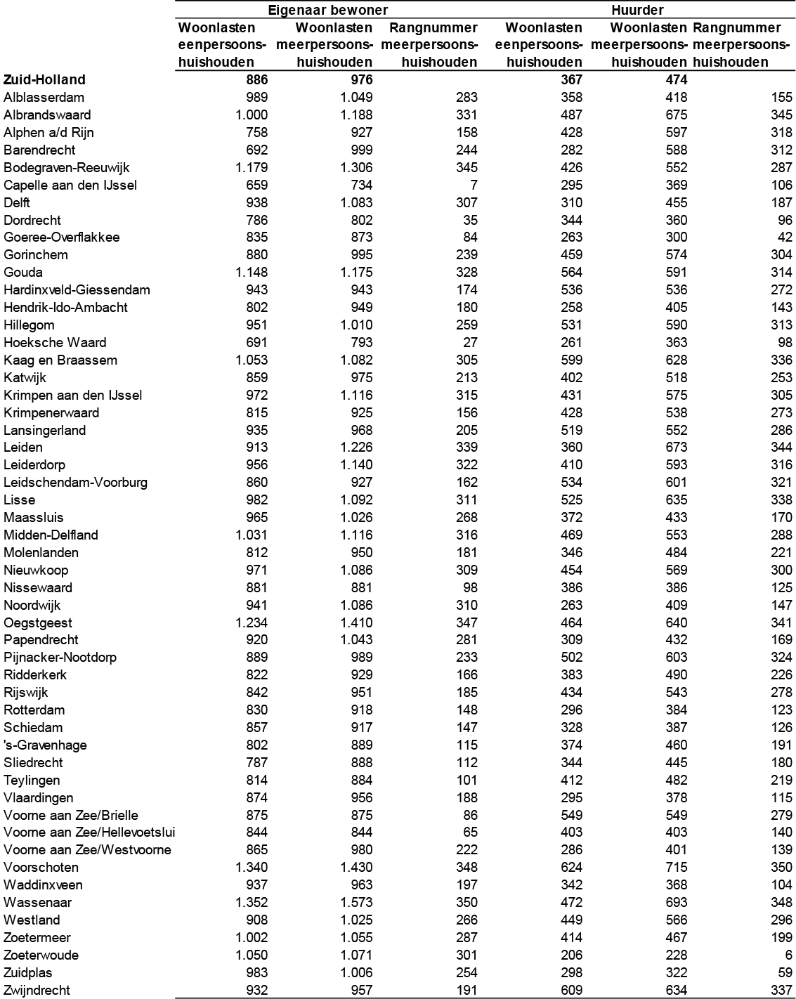 Hier vindt u een overzicht van de woonlasten per gemeente voor eigenaar-bewoners en huurders in de provincie Zuid-Holland.