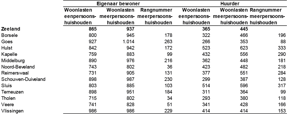 Hier vindt u een overzicht van de woonlasten per gemeente voor eigenaar-bewoners en huurders in de provincie Zeeland.