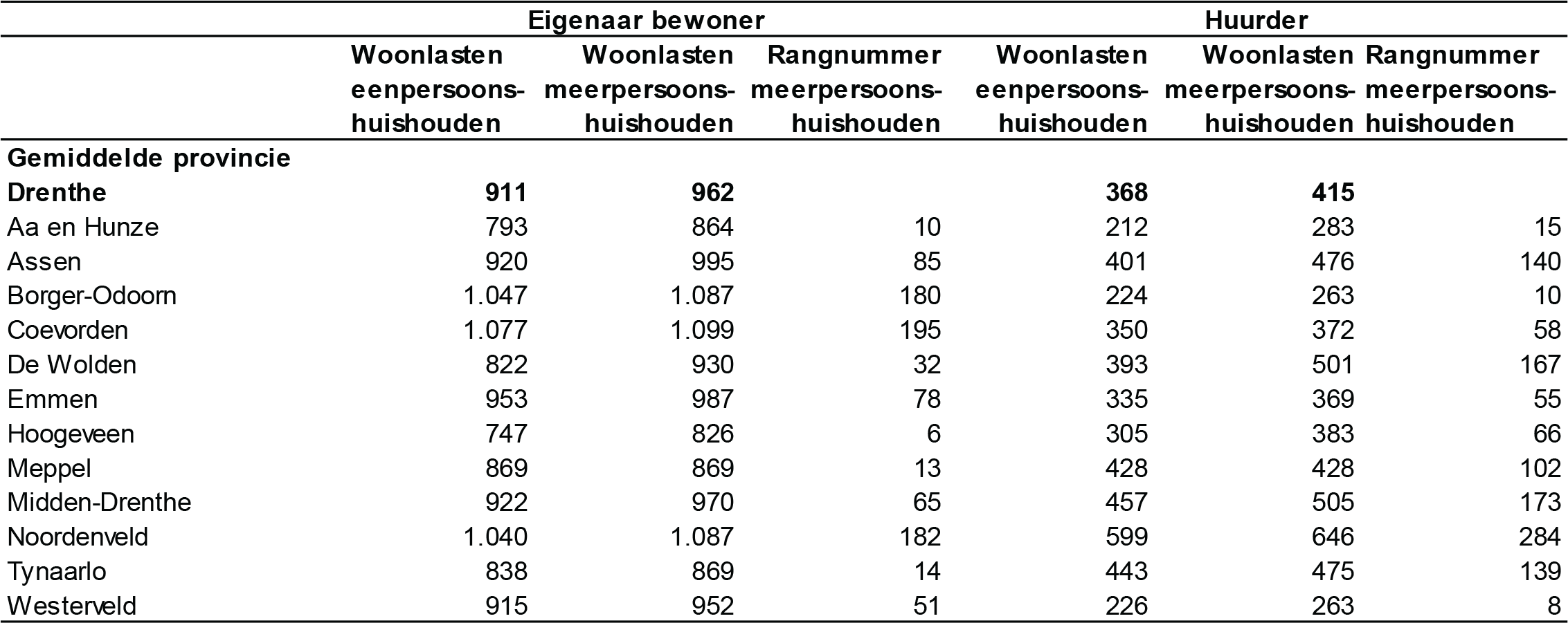 Hier vindt u een overzicht van de woonlasten per gemeente voor eigenaar-bewoners en huurders in de provincie Drenthe.