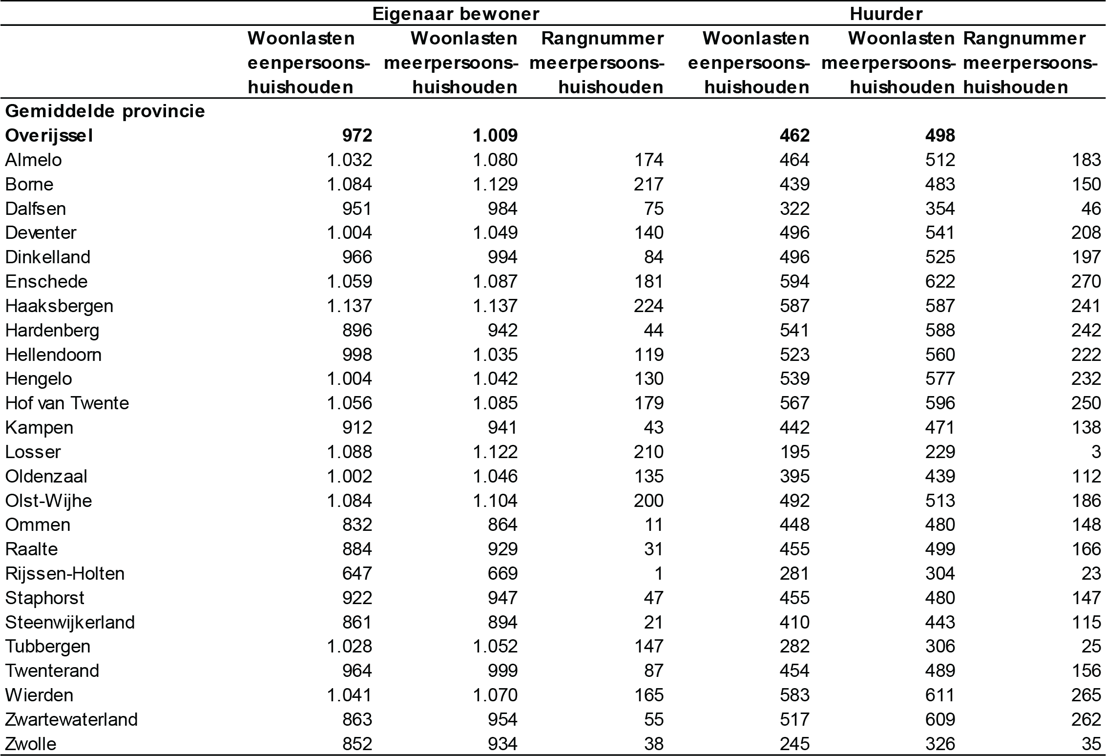 De bovenste rij van de tabel bevat de provinciale gemiddelden. De woonlasten zijn conform kaart 27, kaart 28, kaart 31, en kaart 32.