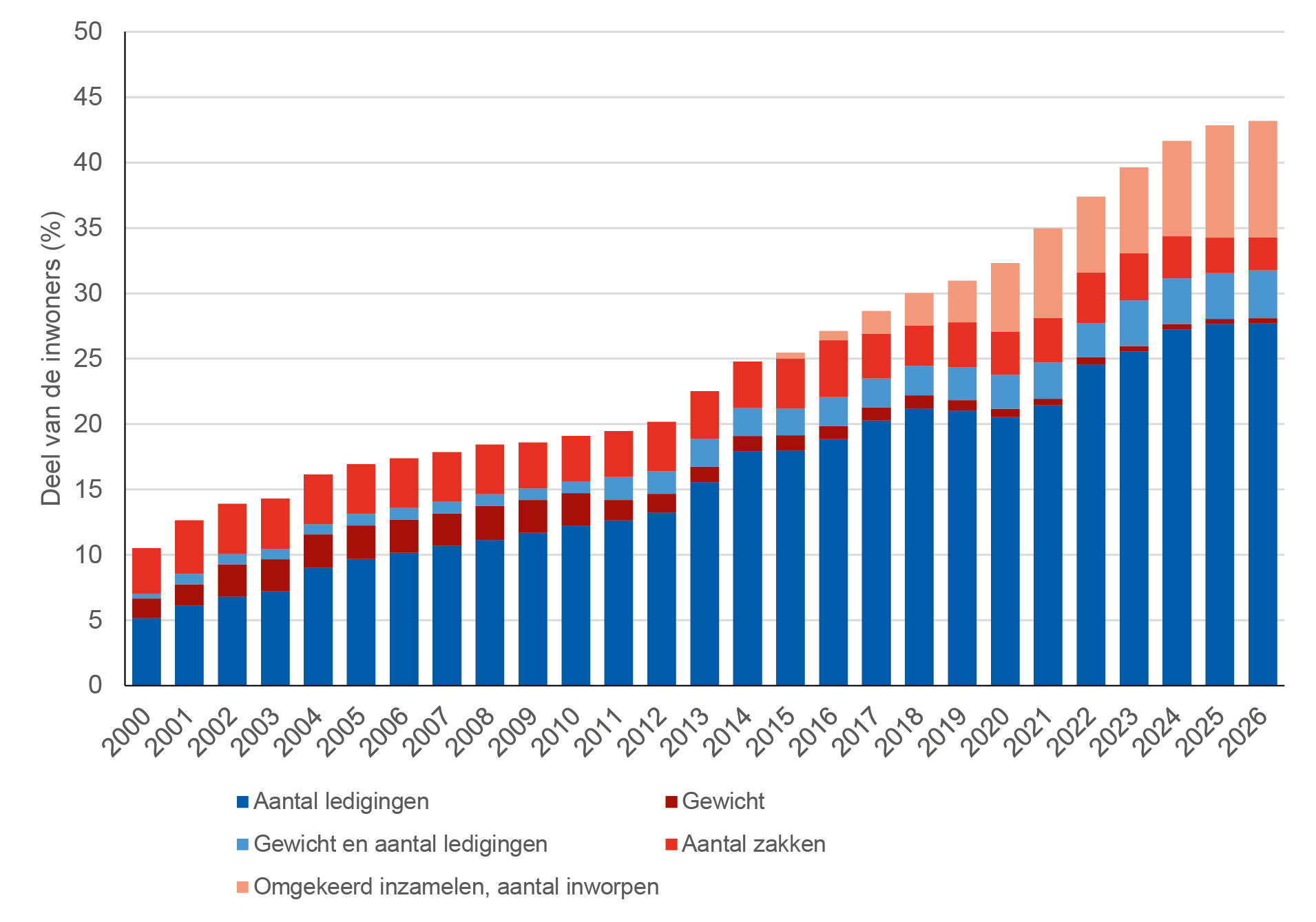 Figuur 1. Deel inwoners waarbij de afvalstoffenheffing afhankelijk is van de hoeveelheid afval (diftar)