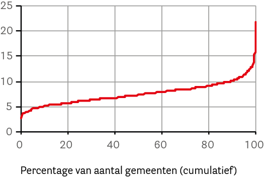 Onder de kaart en de tekst vindt u bij veel kaarten nog een figuur met een rode lijn. In deze figuur zijn alle gemeenten gerangschikt van laagste naar hoogste waarde.