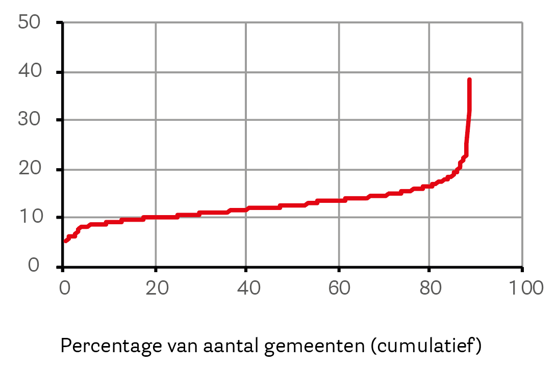 Onder de kaart en de tekst vindt u bij veel kaarten nog een figuur met een rode lijn. In deze figuur zijn alle gemeenten gerangschikt van laagste naar hoogste waarde.