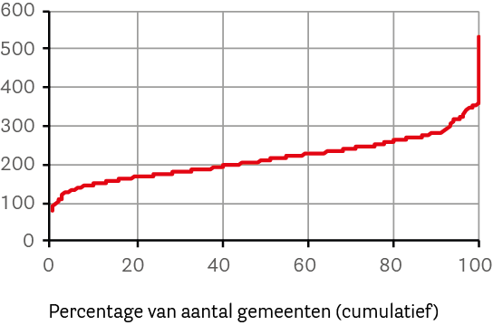 Onder de kaart en de tekst vindt u bij veel kaarten nog een figuur met een rode lijn. In deze figuur zijn alle gemeenten gerangschikt van laagste naar hoogste waarde.