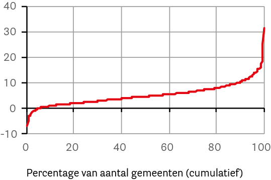 Onder de kaart en de tekst vindt u bij veel kaarten nog een figuur met een rode lijn. In deze figuur zijn alle gemeenten gerangschikt van laagste naar hoogste waarde.