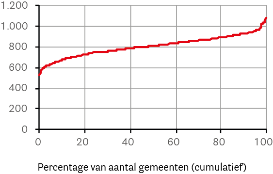 Onder de kaart en de tekst vindt u bij veel kaarten nog een figuur met een rode lijn. In deze figuur zijn alle gemeenten gerangschikt van laagste naar hoogste waarde.
