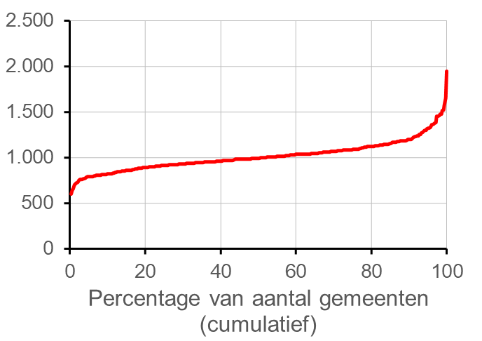 Onder de kaart en de tekst vindt u bij veel kaarten nog een figuur met een rode lijn. In deze figuur zijn alle gemeenten gerangschikt van laagste naar hoogste waarde.