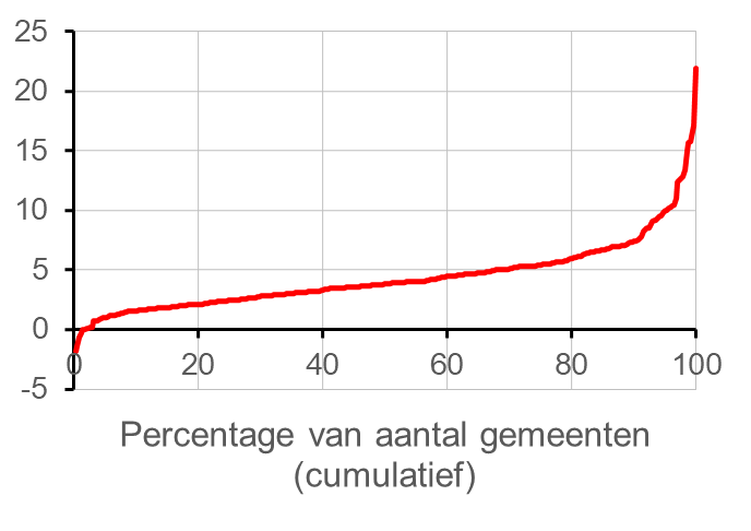 Onder de kaart en de tekst vindt u bij veel kaarten nog een figuur met een rode lijn. In deze figuur zijn alle gemeenten gerangschikt van laagste naar hoogste waarde.