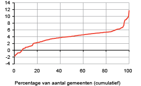 [i] De correlatiecoëfficiënt is 69 procent. Het verband is significant (t=-4,1). Als het kostenaandeel van ingezetenen 1 procentpunt hoger is, dan is het kostenaandeel van gebouwd 1,2 procentpunt lager.