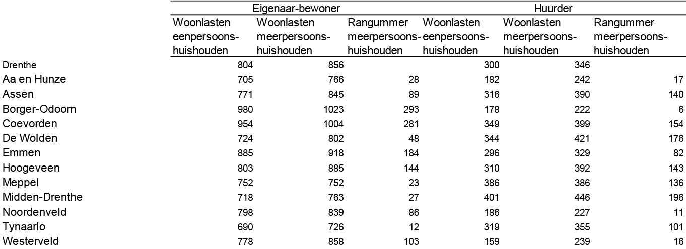 Hier vindt u een overzicht van de woonlasten per gemeente voor eigenaar-bewoners en huurders in de provincie Drenthe.