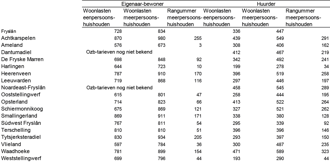 Hier vindt u een overzicht van de woonlasten per gemeente voor eigenaar-bewoners en huurders in de provincie Fryslân.