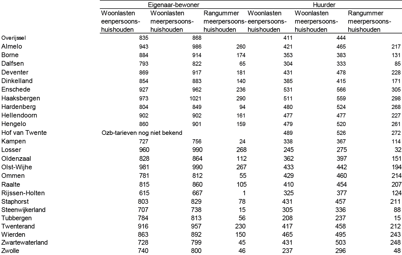 Hier vindt u een overzicht van de woonlasten per gemeente voor eigenaar-bewoners en huurders in de provincie Overijssel.